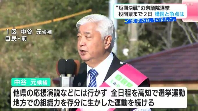 自民党の中谷さんはこれまでの選挙戦とは違って他県の応援などには行かず、全ての日程を高知での選挙運動に注いでいます。地方での組織力を存分にいかした運動を続け、自身の専門分野である防衛・安全保障だけでなく地域性を絡めた林業・農業振興策についても積極的にアピールし、「これらを政権与党が進める必要がある」と支持を訴えています。