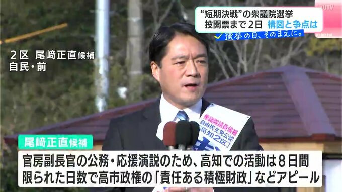 自民党の尾﨑さんは官房副長官の公務や県外での応援演説のため高知での活動は8日間。限られた日数で街頭演説や個人演説会を行い、高市政権が進めようとしている「責任ある積極財政」などをアピールしています。地方議員や市町村長も支援に回っていて、「国が従来以上に積極的な役割を果たす」と訴えて回ります。