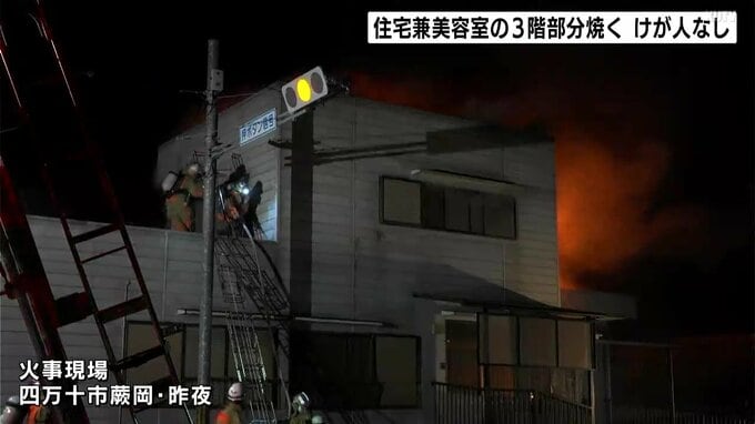 住宅兼美容室の3階部分を焼く火事 けが人なし 2026年2月10日(火) 11:54 国内 9日夜、高知県四万十市で住宅兼店舗の3階部分を焼く火事がありました。けが人はいません。火事があったのは、四万十市蕨岡の住宅兼美容室です。警察と消防の調べによりますと、9日午後7時20分ごろ、この家に住む人…