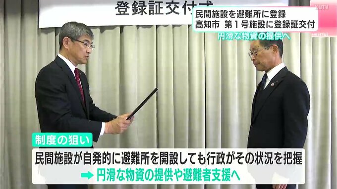 高知市は南海トラフ地震が起きた際、避難所として利用可能な民間施設を登録する独自の制度を1月から始めています。10日、第1号となる施設に登録証が交付されました。