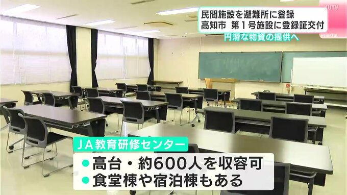 登録証が交付されたのは、高知市春野町のJA教育研修センターです。高知市は2026年1月、耐震基準を満たしている民間施設を対象に、避難所として登録できる制度を開設。民間施設が自発的に避難所を開設しても行政がその状況を把握することが狙いで、円滑な物資の提供や避難者の支援につなげます。