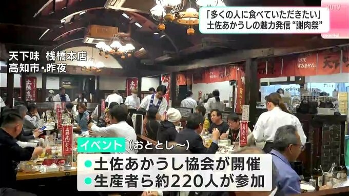 このイベントは、「土佐あかうし」の生産頭数を増やそうと活動する土佐あかうし協会が2024年から開いていて、9日夜は生産者らおよそ220人が参加しました。提供された肉は、5か月間熟成させたもので、うま味や甘み、香りなどが凝縮されているということです。