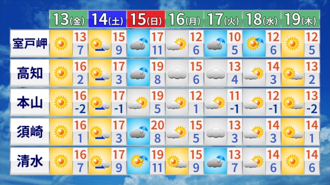 13日の高知県内は、高気圧に覆われて広い範囲でよく晴れそうです。気温も高く、日中の最高気温は15℃を超えるところも出てくる見込みです。春先の陽気となりますが、空気が乾燥しますので火の取り扱いに注意が必要です。