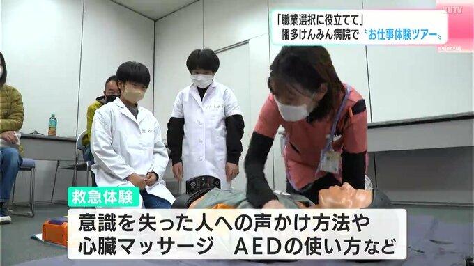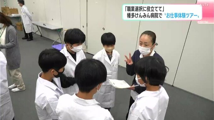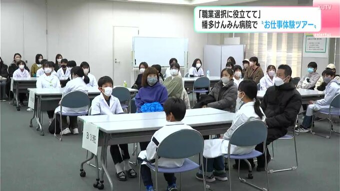 子どもたちの将来の職業選択に役立ててもらいたいと「幡多けんみん病院」が開催した体験ツアー。参加したのは小学5年生から中学3年生までの20人。白衣に身を包んで職場体験が始まりました。