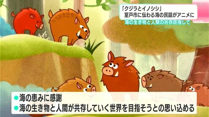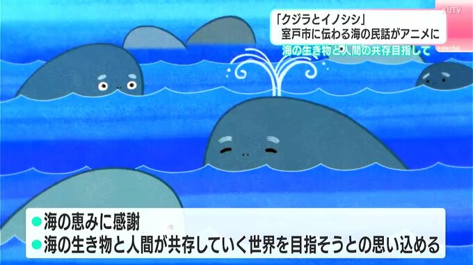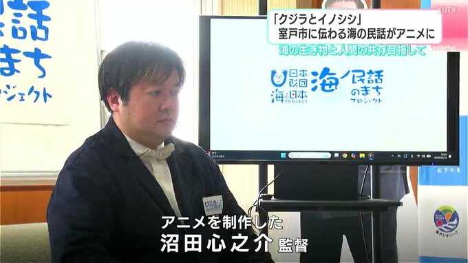 16日はアニメの完成を受け、舞台となった室戸市に「海ノ民話のまち」認定証とDVDが植田壯一郎市長に手渡され、完成したアニメが披露されました。タイトルは「クジラとイノシシ」。室戸にはそれぞれ山と海を見守る神々がいて、山に棲む大きなクジラは、あくびや寝返りで木々を倒してしまい、海に棲むイノシシは泳ぎが下手で、食べ物を得られず苦しんでいました。困った二柱の神は相談し、クジラとイノシシの棲む場所を入れ替えることに。やがてイノシシは山でマムシを見つけて喜び、クジラは海で小魚を食べて暮らすようになったというストーリーです。海の恵みに感謝する心を忘れずに、海の生き物と人間が共存していく世界を目指そうという思いが込められています。