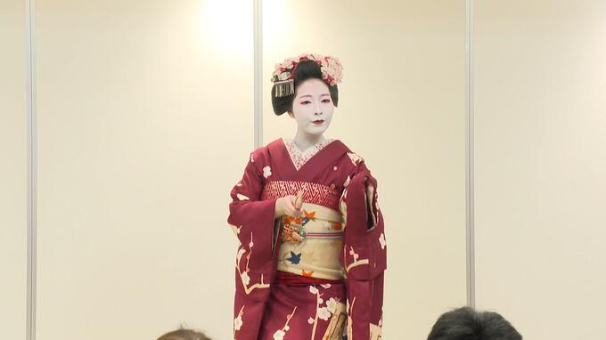 初日の18日は、祇園東の舞妓・叶静(かのしず)さんが、春の訪れとともに舞うという「京の四季」「祇園小唄」「春雨」の3曲を披露しました。