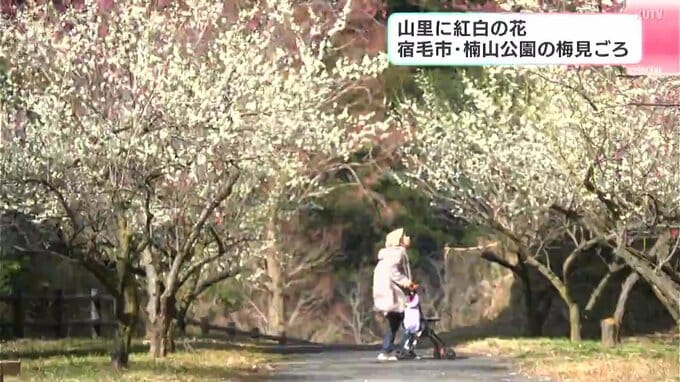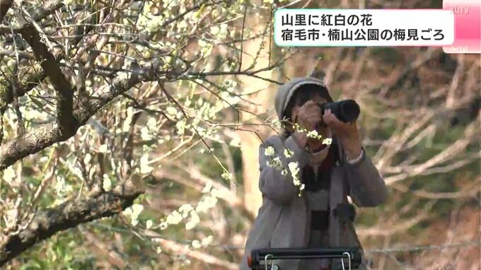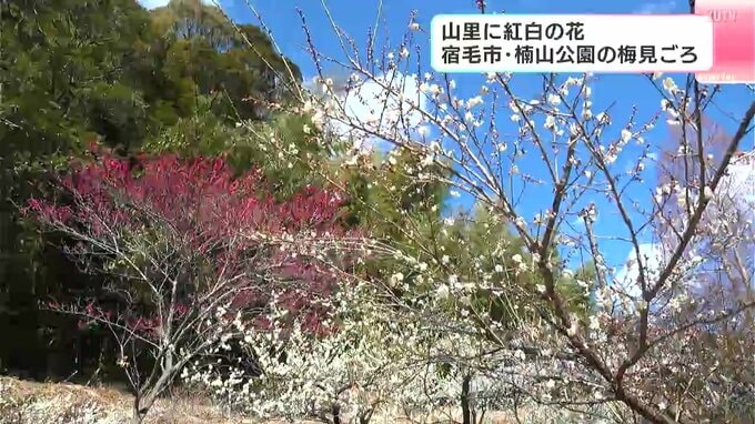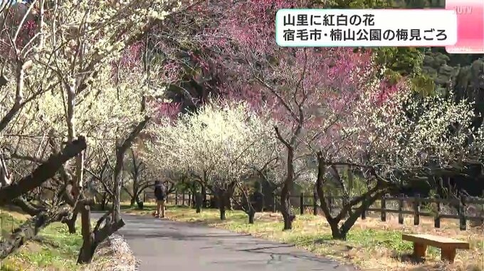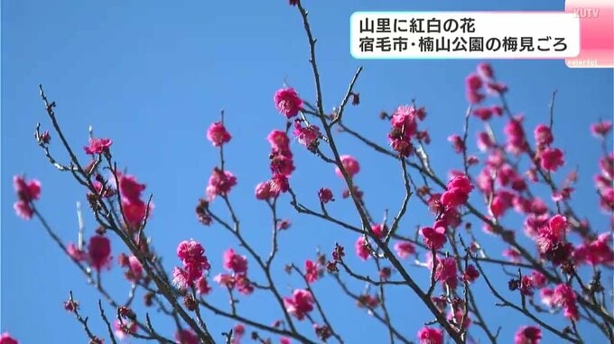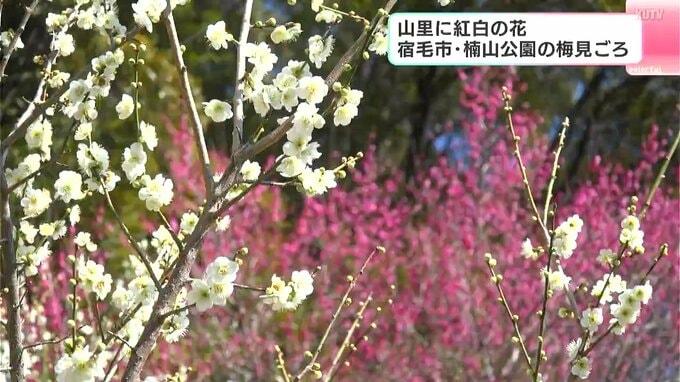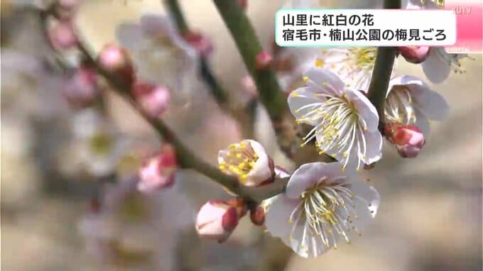 高知県西部・宿毛市の山里にある公園で、紅白の梅の花が見ごろを迎え、訪れた人の目を楽しませています。