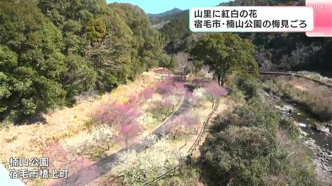 梅の花が見ごろになっているのは、宿毛市橋上町、松田川の上流域にある楠山公園です。7種類・およそ350本の梅の木が植えられた梅園になっていて、地元の人たちが下草を刈って枝の選定をするなどし、手入れを続けています。