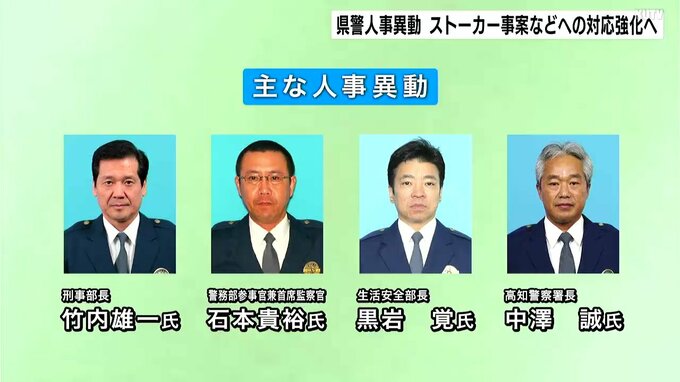 主な人事異動です。刑事部長に竹内雄一氏、警務部参事官兼首席監察官に石本貴裕氏、生活安全部長に黒岩覚氏、高知警察署長に中澤誠氏、などとなっています。