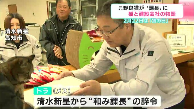 高知市の建設会社清水新星から辞令を受けたのはメスの猫、トラ。役職は“和み課長”です。