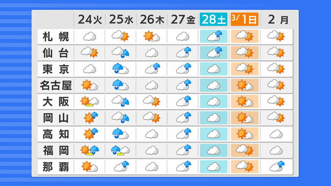 各地“春一番”で気温上昇、今後は前線接近で雨の予報…恵みの雨となるか?【雨風シミュレーション】 2026年2月23日(月) 14:00 国内 天気 南から暖気が流れ込んだため、25日は太平洋側には前線が発生する予想となっています。今後は各地で天気が崩れ、25日と27日は各地で雨の降り方が強まる見込みです。 特に雨の少なかった太平洋側に雨雲が流れ込むでしょう。