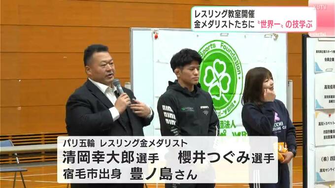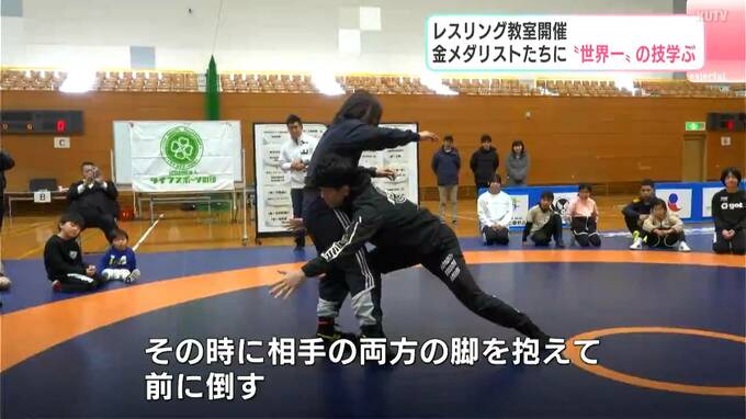 21日、親子を対象にしたレスリング体験教室が高知県宿毛市で開かれ、子どもたちはオリンピック金メダリストから「世界一の技」を学びました。