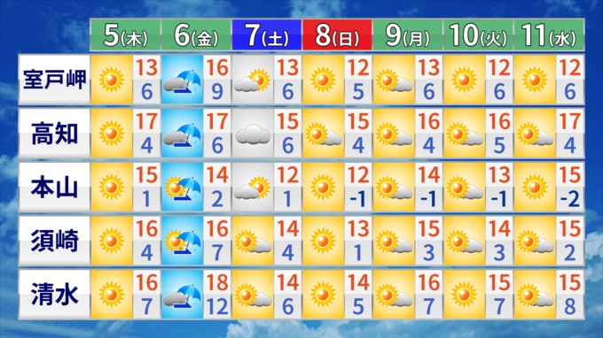5日の高知県内は、高気圧に覆われて広い範囲で晴れるでしょう。一日を通して大きな天気の崩れはなさそうです。朝は、冷え込む地点が多く、山間部では冬日となる所もありそうです。一方、日中の最高気温は平年よりも高く15℃を超えるところが多くなるでしょう。