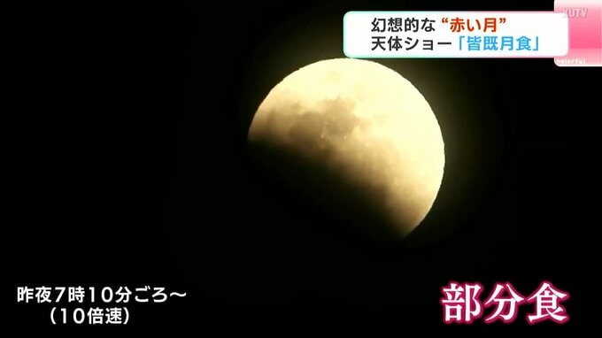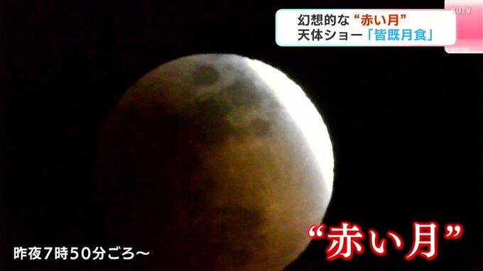 「皆既月食」は、月が地球の影に覆われる天体現象です。3日夜は県内でも、午後6時50分ごろから月の一部が欠け始める「部分食」が始まり、午後7時20分ごろには月が半分ほど欠けました。そして、月全体が見えなくなる「皆既食」の時間帯=午後8時4分が近づくと、夜空には幻想的な“赤い月”が浮かび上がりました。