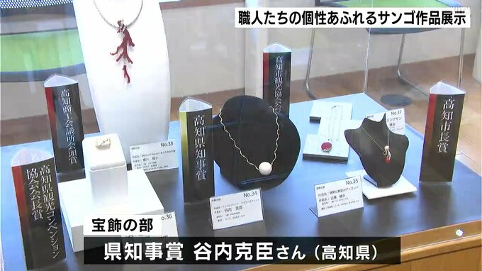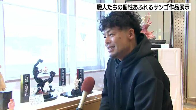 2026年で50回目を迎えた「土佐さんごまつり名作コンテスト」。全高知珊瑚協同組合連合会が宝石サンゴの魅力発信と、職人たちの技術の向上を目指し開催しています。このうち入賞作品66点がオーテピア高知図書館で、展示されています。立体・平面彫刻の部で県知事賞に選ばれたのは、山下雄己さんの作品。さまざまなキノコを並べ森の豊かさを表現していて、色の使い分けや卓越した彫刻が評価されました。