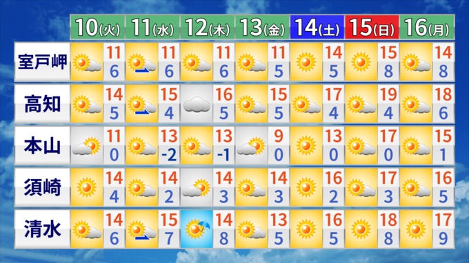 向こう1週間は、晴れる日が多くなるでしょう。12日の木曜日は、低気圧の影響で雲が広がりやすく雨の降るところがありそうです。気温は平年並みの日が多く、日中でも肌寒い日が続くでしょう。