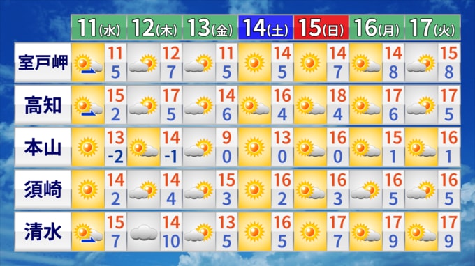 11日の高知県内は、高気圧に覆われて晴れるでしょう。朝の最低気温は、平年のこの時期よりも低く、冷え込みの厳しいところが多くなるでしょう。日中の最高気温は、平年並みに留まる見込みです。前日に続き、空気も乾燥しますので火の取り扱いに注意が必要です。