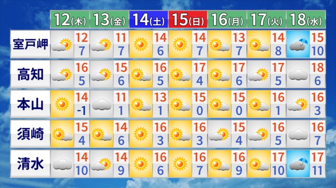 12日の高知県内は、日差しの届く所が多くなりますが、気圧の谷や寒気の影響で雲が広がりやすく、西部では午後から雨や雷雨となる所がある見込みです。東部・西部では風の強まる時間もあり、空模様の変化に注意が必要です。