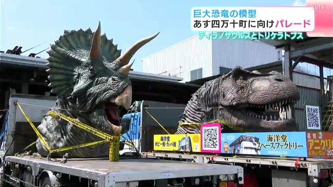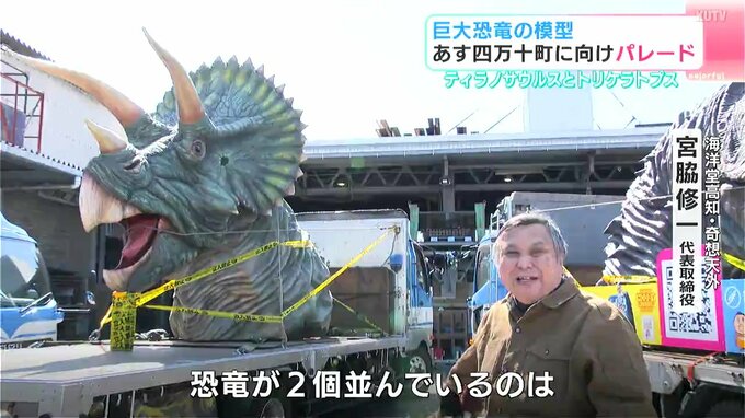 こちらが14日の恐竜ヘッドパレードの主役、ティラノサウルスとトリケラトプスの模型です。今にも動き出しそうで見ごたえ十分です。パレードは県内にある海洋堂の2つの施設がリニューアルすることから、海洋堂や高知信用金庫などが地域活性化を目的に実施します。