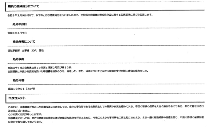 処分を受けたのは土佐清水市・福祉事務所の30代男性主事補です。