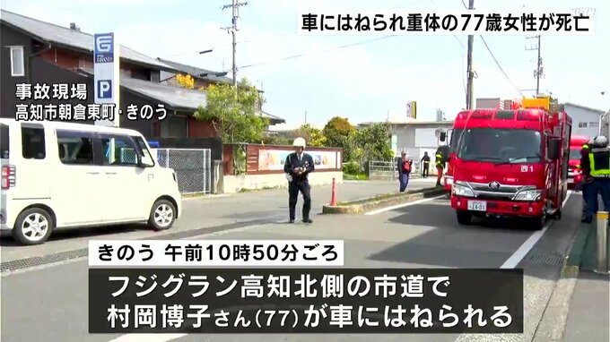 この事故は、17日午前10時50分ごろ、高知市朝倉東町のフジグラン高知北側の市道で、高知市の村岡博子さん(77)が、軽乗用車にはねられたものです。村岡さんは頭などを打ち意識不明の重体となっていましたが、18日朝7時半ごろ搬送先の病院で死亡しました。死因は出血性ショックとみられています。