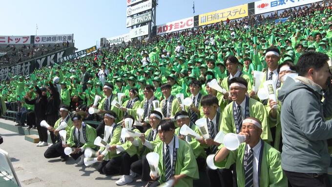 「およそ1100人の大応援団で、スクールカラーの“緑色”に染まった1塁側アルプススタンド!まもなく、高知農業、学校史上初めての甲子園での戦いが始まります!」