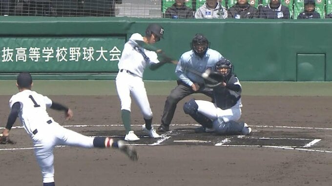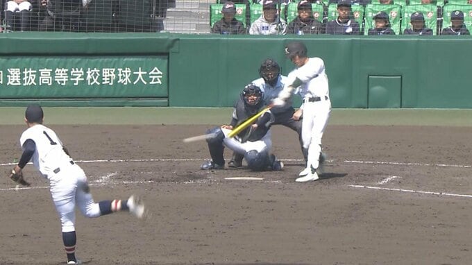 そのウラ、1回ウラの高知農業の攻撃では、2番・西岡和真選手が初球を振り抜くと、打球はショートの頭上を越え左中間へ。逆方向への鮮やかな2塁打を放ち、これが甲子園で高知農業史上初のヒットとなります。