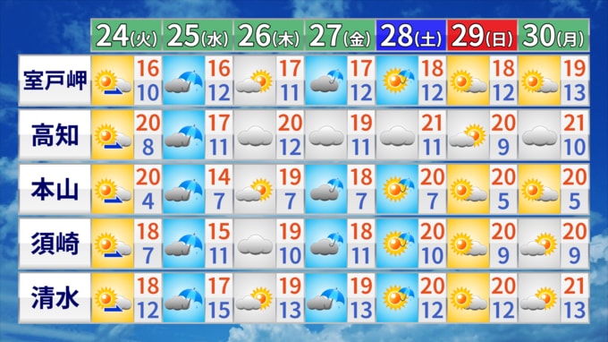 24日の高知県内は、高気圧に覆われて晴れますが、気圧の谷や湿った空気の影響で夕方から雲が広がりやすくなるところがある見込みです。気温は、平野部・山沿いともに20℃前後と暖かい春の陽気を感じられるでしょう。
