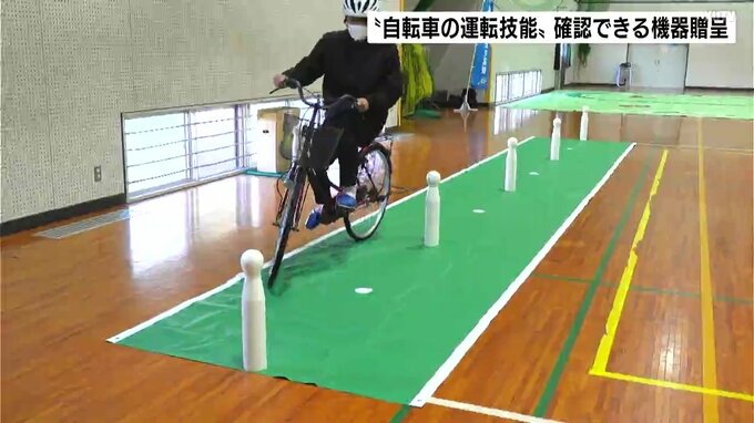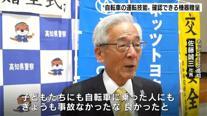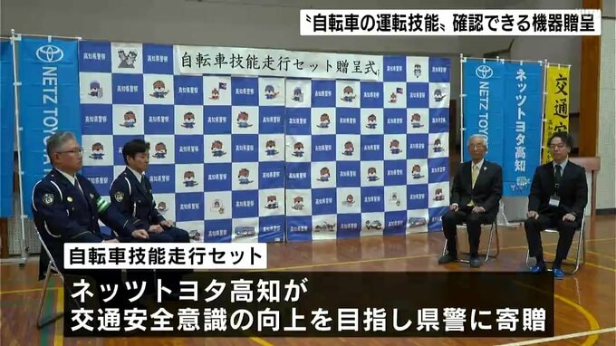 これらの機器は県内で自動車販売を展開するネッツトヨタ高知が、自転車の技能を確認し高めることで、地域全体の交通安全意識を向上させたいとの思いから、県警に寄贈しました。