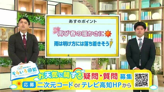 高知の天気 26日 日差し戻る 日中は上着いらずの暖かさに 山岸拓気象予報士が解説 2026年3月25日(水) 18:25 国内 天気 26日の高知県内は、湿った空気の影響で未明から明け方にかけて雨の降る所があるでしょう。日中は雲の隙間から日差しが届く所も多くなる見込みで、日中の最高気温は、高知市や須崎市などで20℃以上となりそうです。…