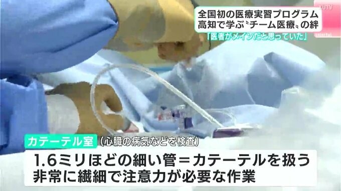 こちらは、心臓の病気などを検査するカテーテル室。1.6ミリほどの細い管=カテーテルを扱う非常に繊細で、注意力が必要な作業が行われています。生徒たちが注目したのは、現場に携わる人たちの“あうんの呼吸”です。