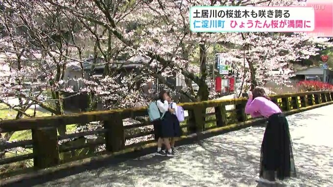 仁淀川町では土居川沿いのソメイヨシノも今、見ごろを迎えています。およそ800メートルの桜並木が楽しめるスポットで、訪れた人たちは写真を撮るなどし楽しんでいました。