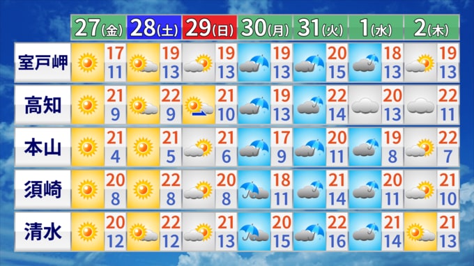 27日の高知県内は、高気圧に覆われてよく晴れるでしょう。日中の最高気温は、20℃を超えるところが多く、春本番の陽気となりそうです。山間部では霜注意報が発表されている地域もあり、農作物の管理にご注意ください。