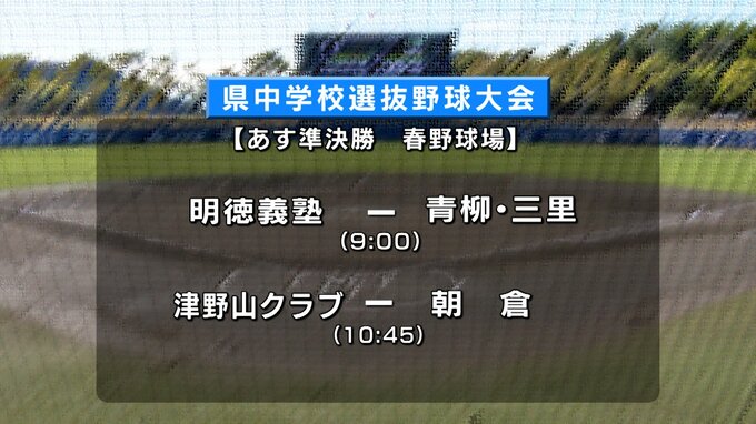 29日は決勝進出をかけた準決勝2試合が、春野球場で行われます。第一試合は明徳義塾対青柳・三里連合で午前9時プレーボール予定、第2試合、津野山クラブ対朝倉は午前10時45分プレーボール予定です。
