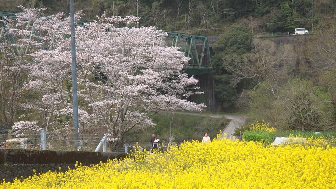 清流・四万十川沿いにあるキャンプ場の周辺で、桜と菜の花が咲き誇り、ピンク色と黄色のコントラストが、訪れた人たちの目を楽しませています。
