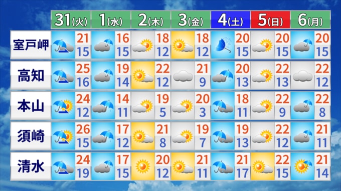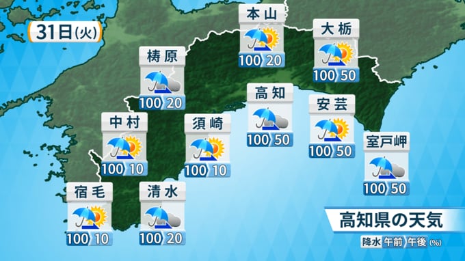 31日の高知県内は、低気圧や前線の影響で曇り、昼過ぎにかけて雨や雷雨となる見込みです。未明から朝にかけては、非常に激しい雨の降る所があるでしょう。気温は南風の影響で高く、高知市でも25度以上の夏日予想となっています。雨により蒸し暑く感じられる所もあるでしょう。