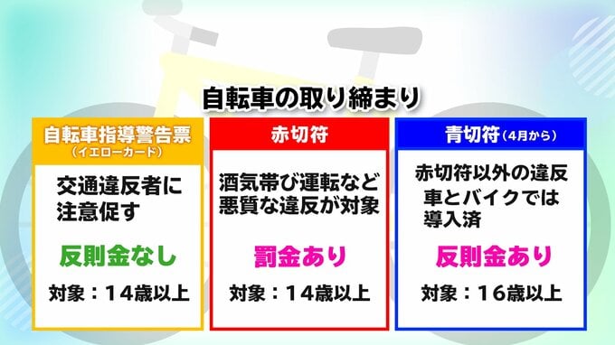 「青切符」とは、比較的軽微な交通整理に対し、刑事罰に代えて反則金の納付で処理する制度で、対象は「16歳以上」です。これまで自転車に対する交通違反は、軽い違反をした場合に注意を促す「指導警告票=イエローカード」と、飲酒運転など悪質な違反をした場合に罰する「赤切符」の2種類のみでした。4月からはこれに「青切符」が加わり、処理が3種類に分かれることになります。