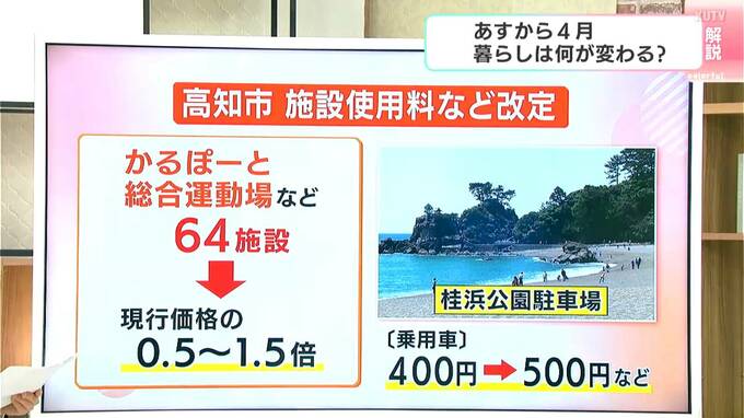 ここまでは全国的な「値上げ・値上がり」についてみてきましたが、高知市でも施設の使用料などが改定されます。対象は市内64の施設で、使用料などが0.5倍から1.5倍の範囲で改定されます。