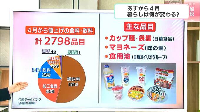 まずは、私たちの生活に直結する「値上げ」についてです。帝国データバンクが31日に発表した4月に値上げされる食料や飲料は、2798品目が対象です。詳しい内訳で見ますとこちらです。