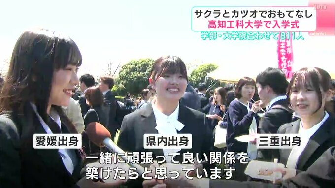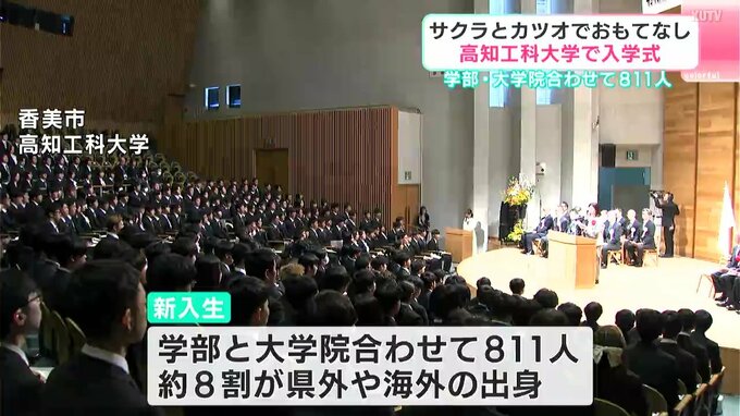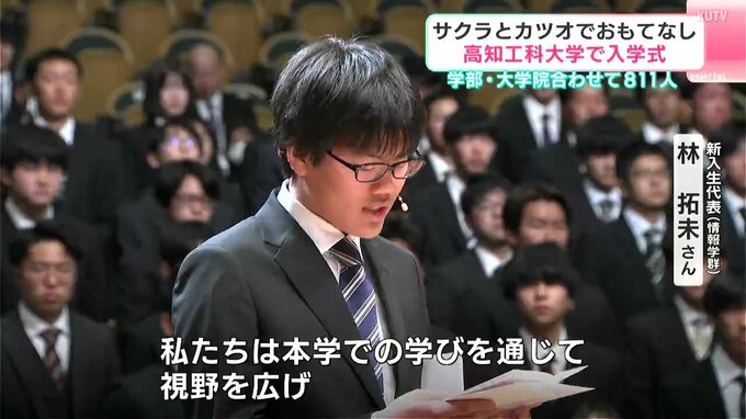 高知工科大学に入学したのは、学部と大学院合わせて811人。そのおよそ8割が県外や海外の出身です。入学式で蝶野成臣学長は、「自ら考え行動する人が未来を拓く。積極的に行動する姿勢を身につけてほしい」とコメント。新入生代表の情報学群・林拓未さんが成長を誓いました。