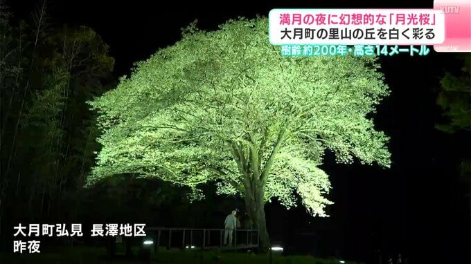照明の光を浴びて白く輝いているのは大月町弘見、長澤地区の丘の上に立つ「月光桜」の花びらです。樹齢およそ200年のヤマザクラの一種とされるこの桜は、高さ14メートル。四方に力強く伸びた枝ぶりが美しく、その白い花びらが光を反射して、里山の夜を幻想的に彩っています。