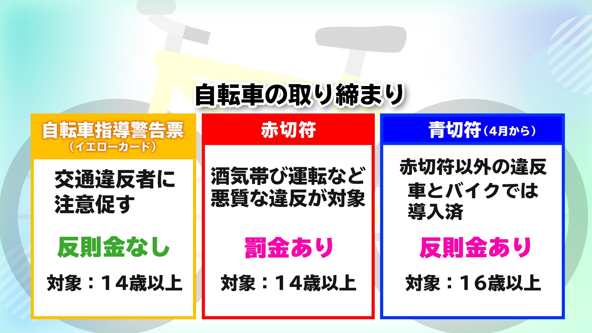 「青切符」とは、比較的軽微な交通違反に対し、刑事罰に代えて反則金の納付で処理する制度で、対象は「16歳以上」です。これまで自転車に対する交通違反は、軽い違反をした場合に注意を促す「指導警告票=イエローカード」と、飲酒運転など悪質な違反をした場合に罰する「赤切符」の2種類のみでしたが、4月からは処理が3種類に分かれることになります。