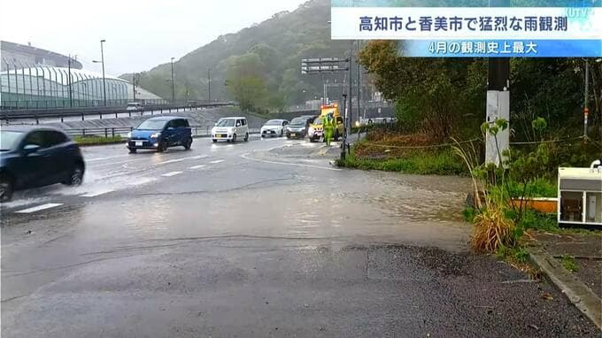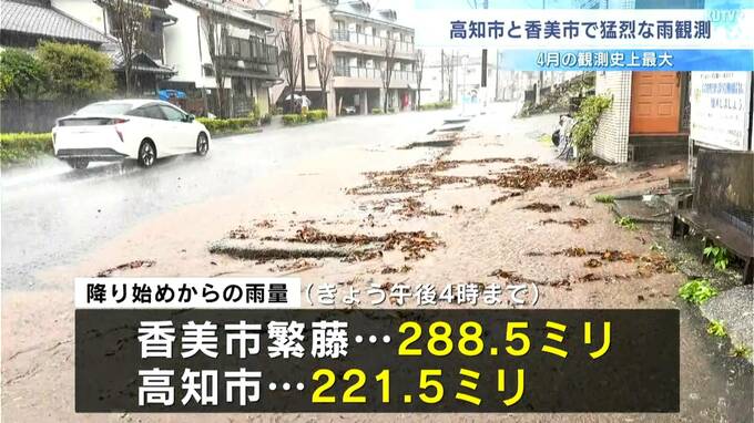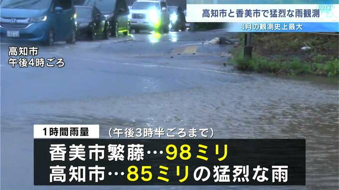 県中部では昼前から雨が強まり、4日午後3時半頃までの1時間に、香美市繁藤で98ミリ、高知市で85ミリと、4月の観測史上最大となる猛烈な雨を観測しました。
