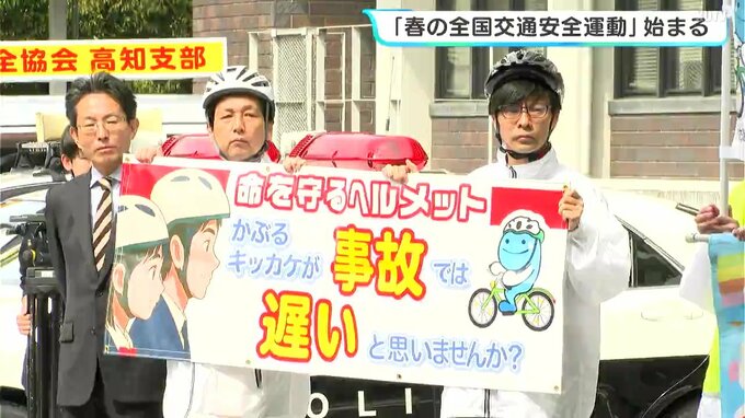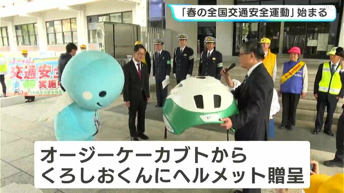 「春の全国交通安全運動」は、4月から青切符が導入された「自転車の交通ルールの理解・遵守の徹底」などを重点目標としています。6日の出発式では、県と協定を結ぶヘルメットメーカー「オージーケーカブト」から、県のマスコットキャラクターくろしおくんにヘルメットが贈呈されました。濵田知事は、「くろしおくんの姿を見せてヘルメット着用の啓発を強めたい」などとあいさつしました。