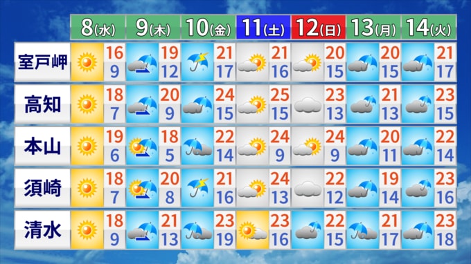 向こう1週間は、傘の出番が多くなるでしょう。10日(金)は朝から雨が降り、雨風の強まる時間もありそうです。気温は平年よりも高い日が多く、11日(土)には高知市で25℃の予想となっています。
