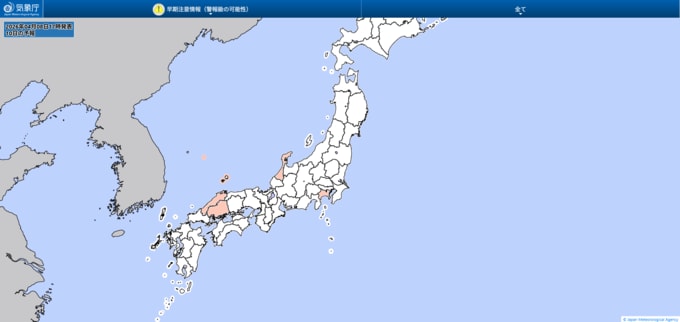 10日の早期注意情報をみると、広島県や石川県で警報級の大雨の可能性が「中」となっています。