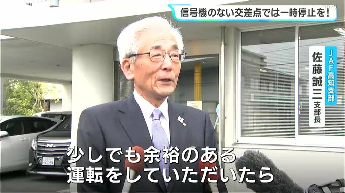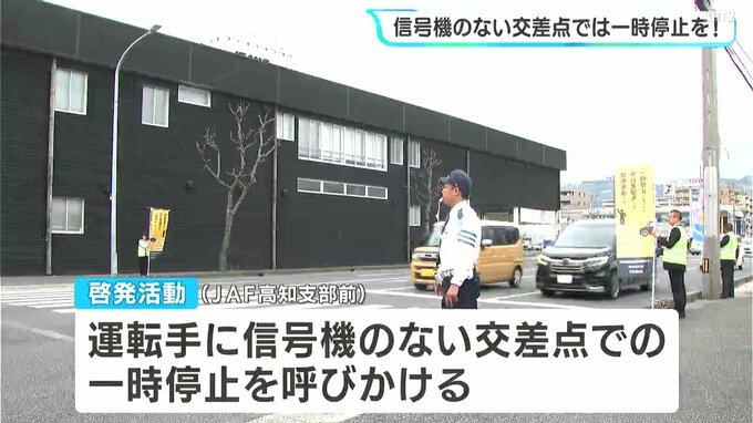 啓発活動は、春の全国交通安全運動にあわせ、高知県内およそ90箇所で行われました。このうち高知市北久保のJAF高知支部前では、JAFや自動車ディーラーの社員らが、車の運転手に信号機のない交差点での一時停止を呼びかけました。