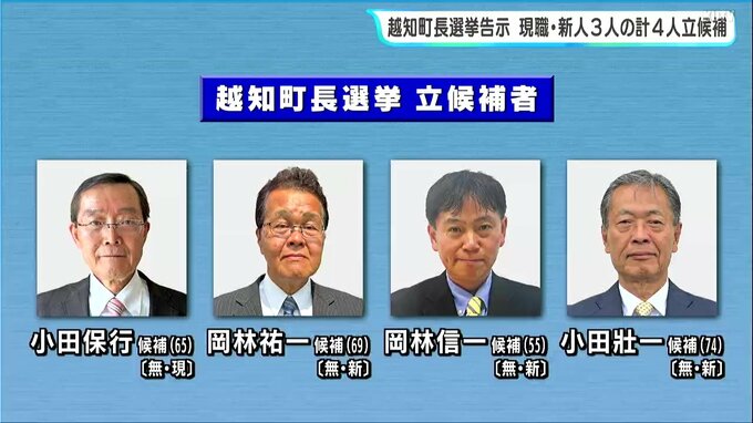 任期満了に伴う、高知県越知町の町長選挙が、4月14日、告示されました。これまでに、現職と新人3人のあわせて4人が立候補していて、4人の選挙戦が確定した場合は、1970年以来・56年ぶりです。