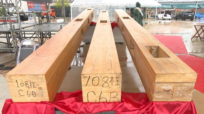 15日、高知市の「大旺新洋おまち多目的広場」では、大阪・関西万博のシンボルとなった「大屋根リング」の柱に使われた木材がお披露目されました。展示されるのは、長さ約8m・重さ約900kgのヒノキ材、3本です。