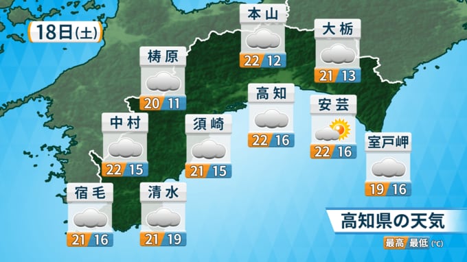 18日の高知県内は、気圧の谷や湿った空気の影響で概ね曇り、昼過ぎまで雨の降る所がある見込みです。気温は平年並みのところが多く、過ごしやすい気温となるでしょう。